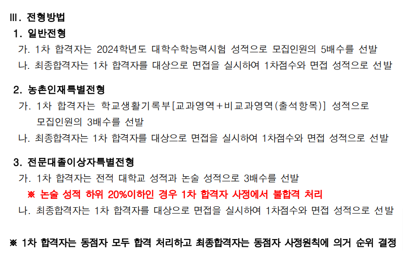 전형방법 역시 전형에 따라 상이하지만, 공통적으로 1차 성적을 가지고 합격자를 추린 후, 해당인원에 대해 면접을 실시합니다. 1차 성적은 일반전형의 경우 수능점수, 농촌인재 특별전형은 학생부(교과 + 출석), 전문대졸이상자 특별전형은 전적 대학 성적으로 합격차를 선발하고 논술시험에 합격해야 면접을 볼 수 있습니다.